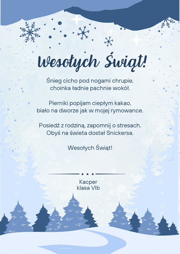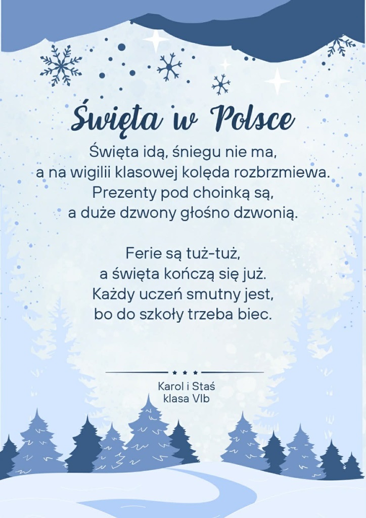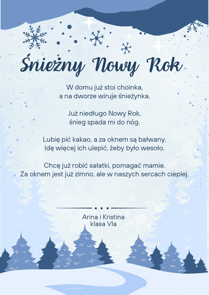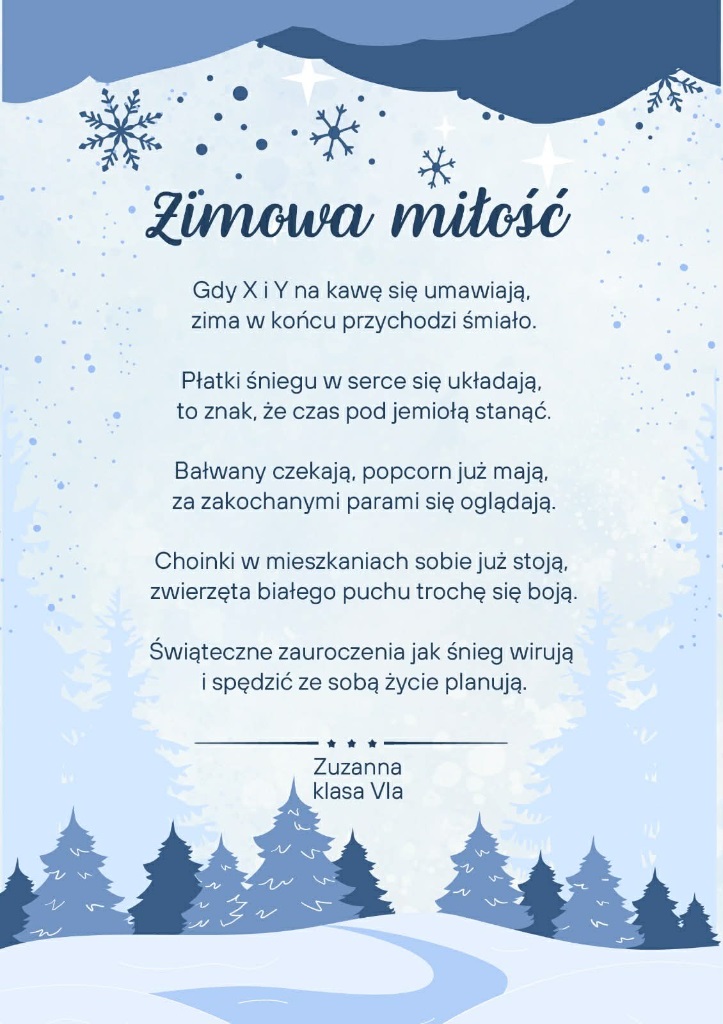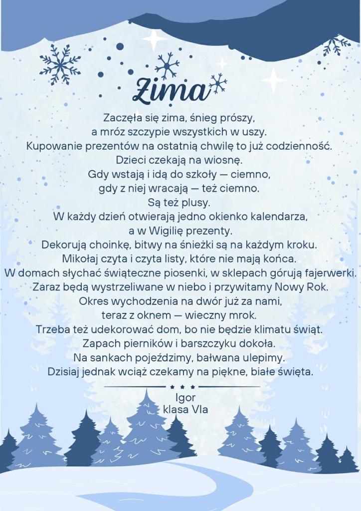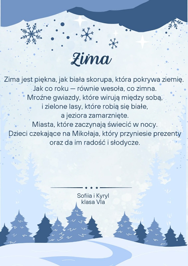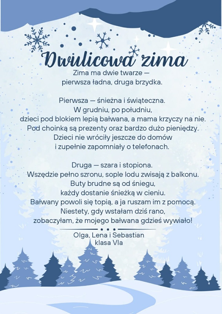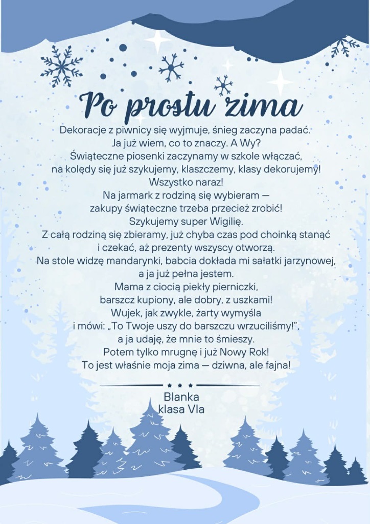 Zima po raz kolejny stała się inspiracją dla uczniów klas szóstych, którzy na lekcjach języka polskiego realizowali literacki projekt „Pory roku w poezji”. W tej edycji młodzi twórcy próbowali w swoich wersach uchwycić zimowy nastrój, obrazy przyrody oraz towarzyszące im emocje.