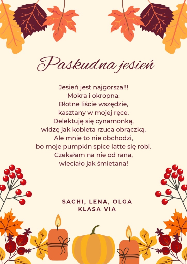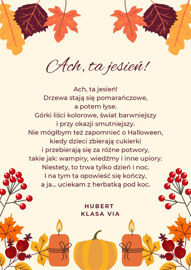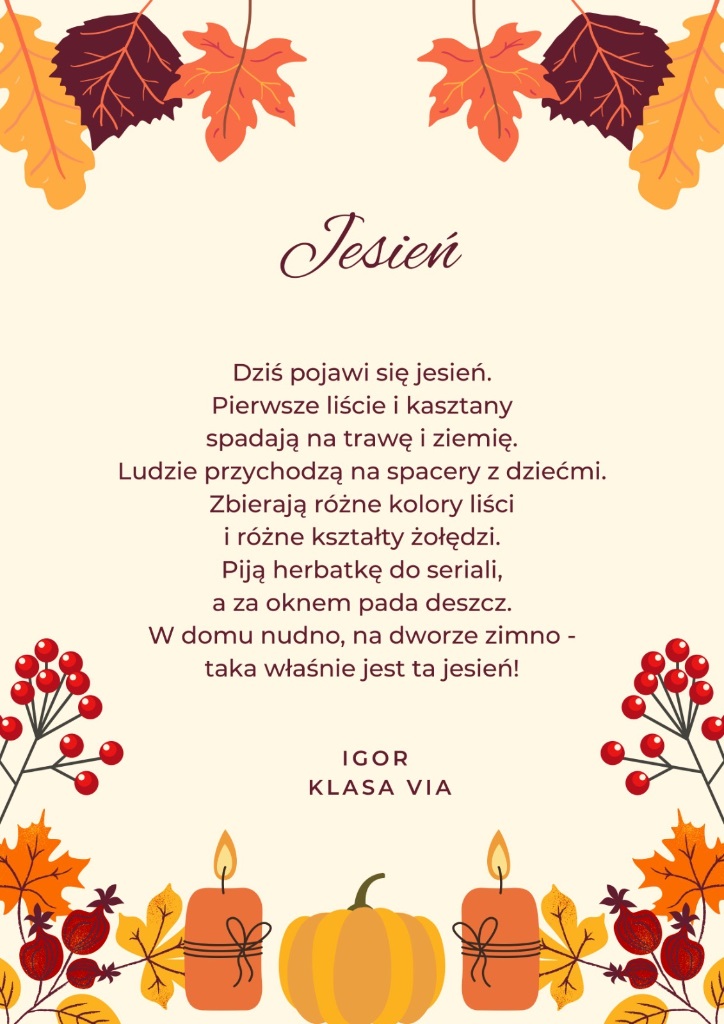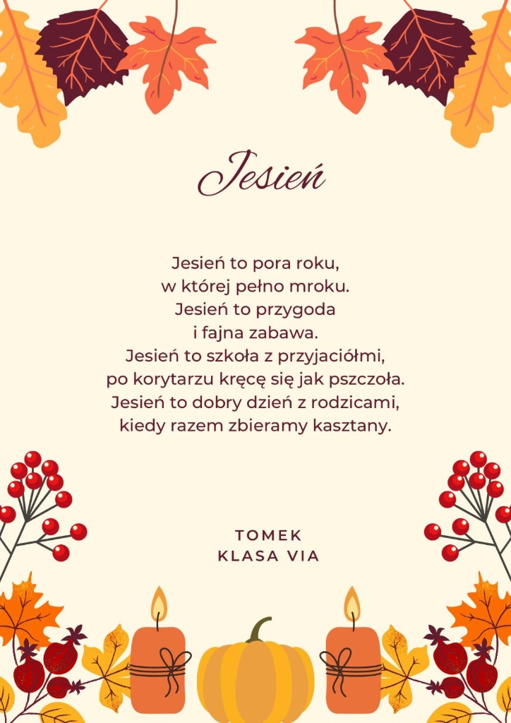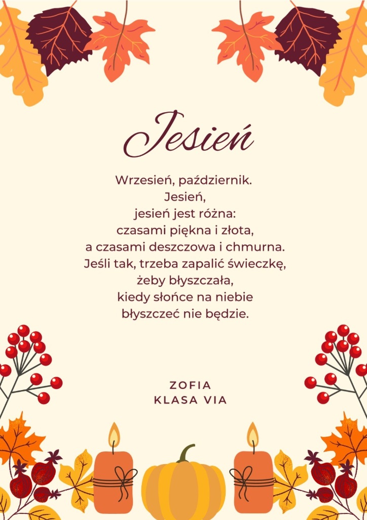 Zachęcamy do zapoznania się z dziełami naszych zdolnych uczniów. Niech każdy wers przeniesie Was w złocisty pejzaż jesiennych dni, gdzie słowa pachną cynamonem, a rymy wirują wśród liści.