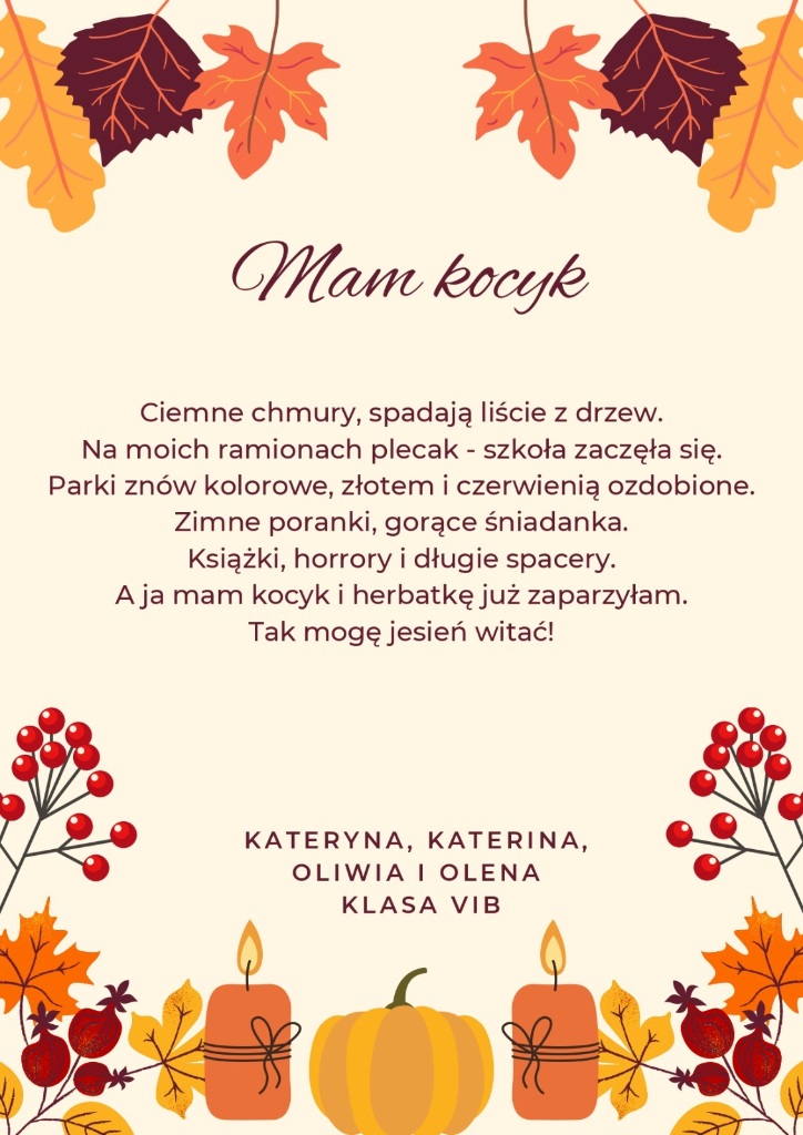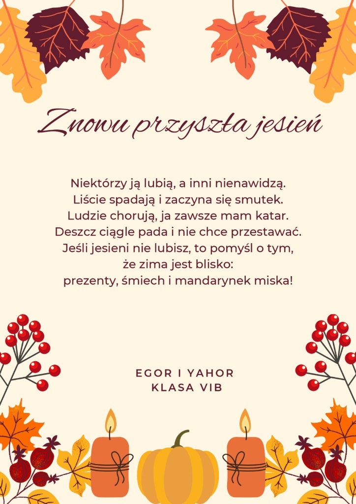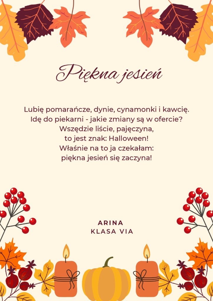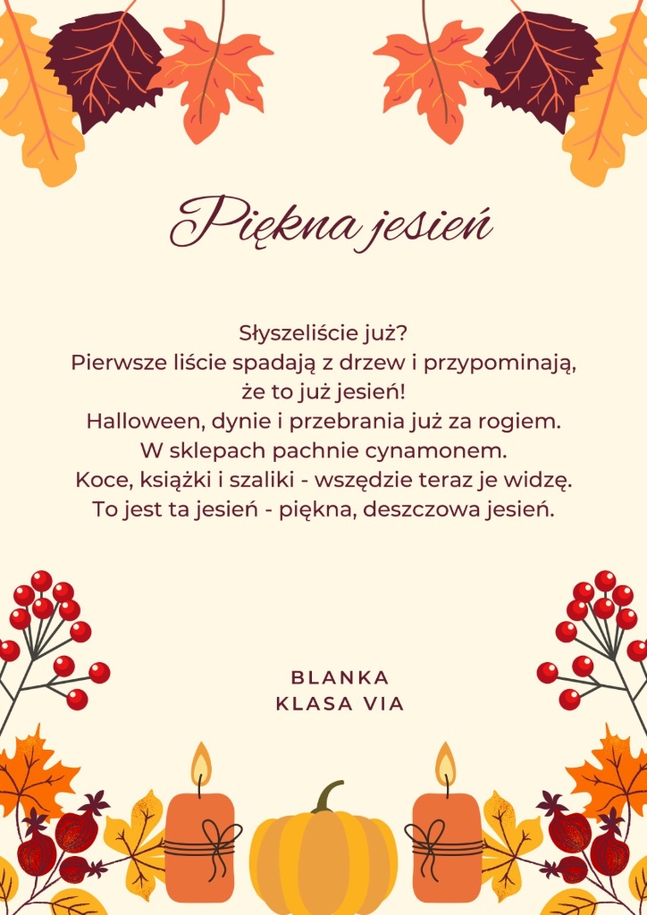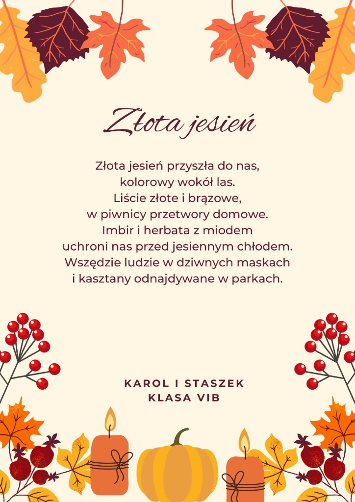 Zachęcamy do zapoznania się z dziełami naszych zdolnych uczniów. Niech każdy wers przeniesie Was w złocisty pejzaż jesiennych dni, gdzie słowa pachną cynamonem, a rymy wirują wśród liści.