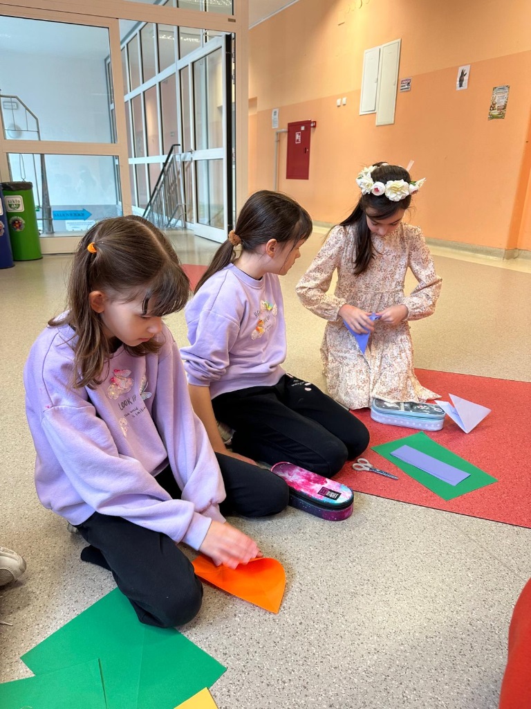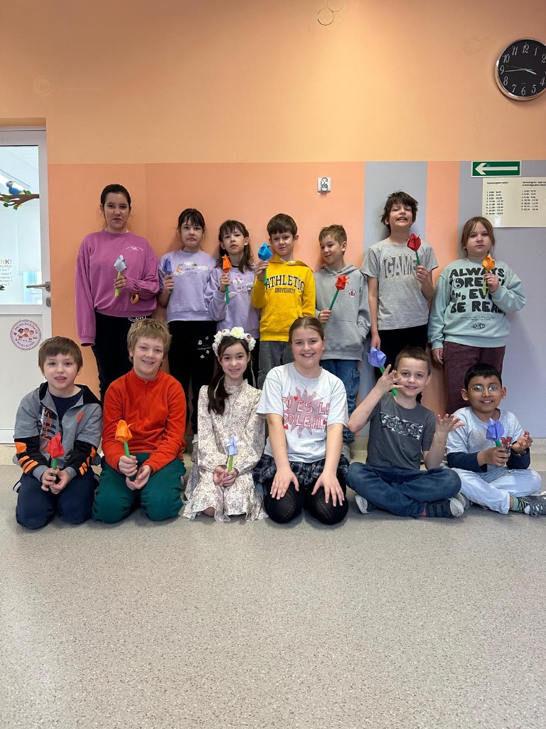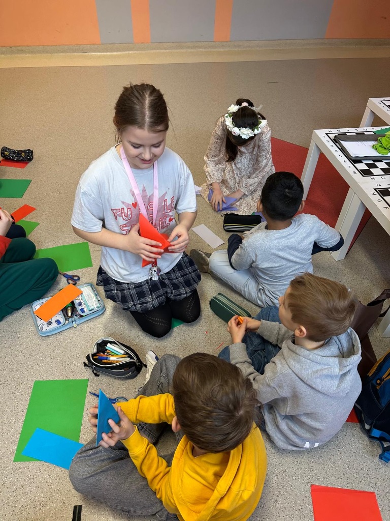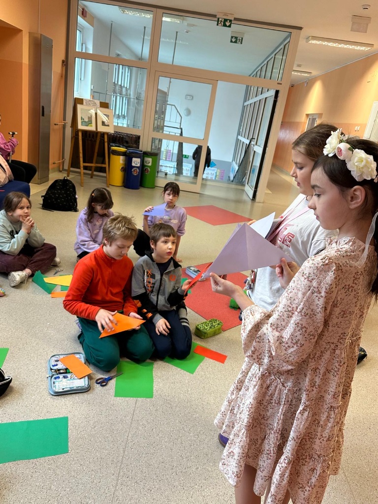 Uczniowie klasy trzeciej realizują niezwykle wartościową inicjatywę – prowadzą tzw. lekcje koleżeńskie według własnych pomysłów. Samodzielnie przygotowują zajęcia, opracowują materiały i wcielają się w rolę nauczycieli. Pierwsze zajęcia były poświęcone origami – dwie uczennice przygotowały i poprowadziły lekcję, podczas której cała klasa uczyła się tworzyć papierowe kwiaty. Dzięki temu rozwijają nie tylko wiedzę merytoryczną, ale także umiejętności prezentacji, współpracy, komunikacji i odpowiedzialności za proces uczenia się. To świetna okazja do budowania pewności siebie oraz kreatywnego myślenia.