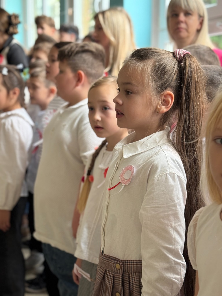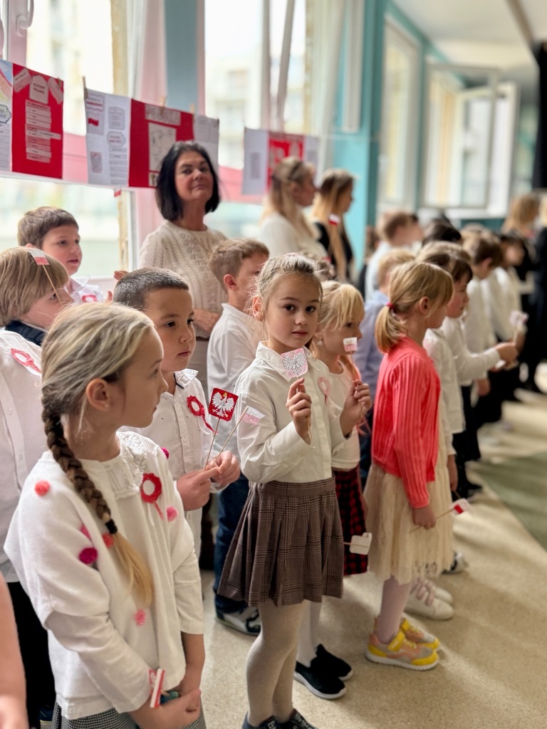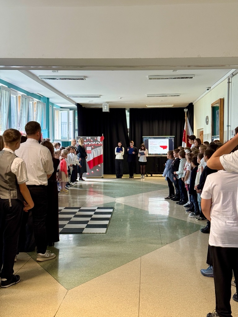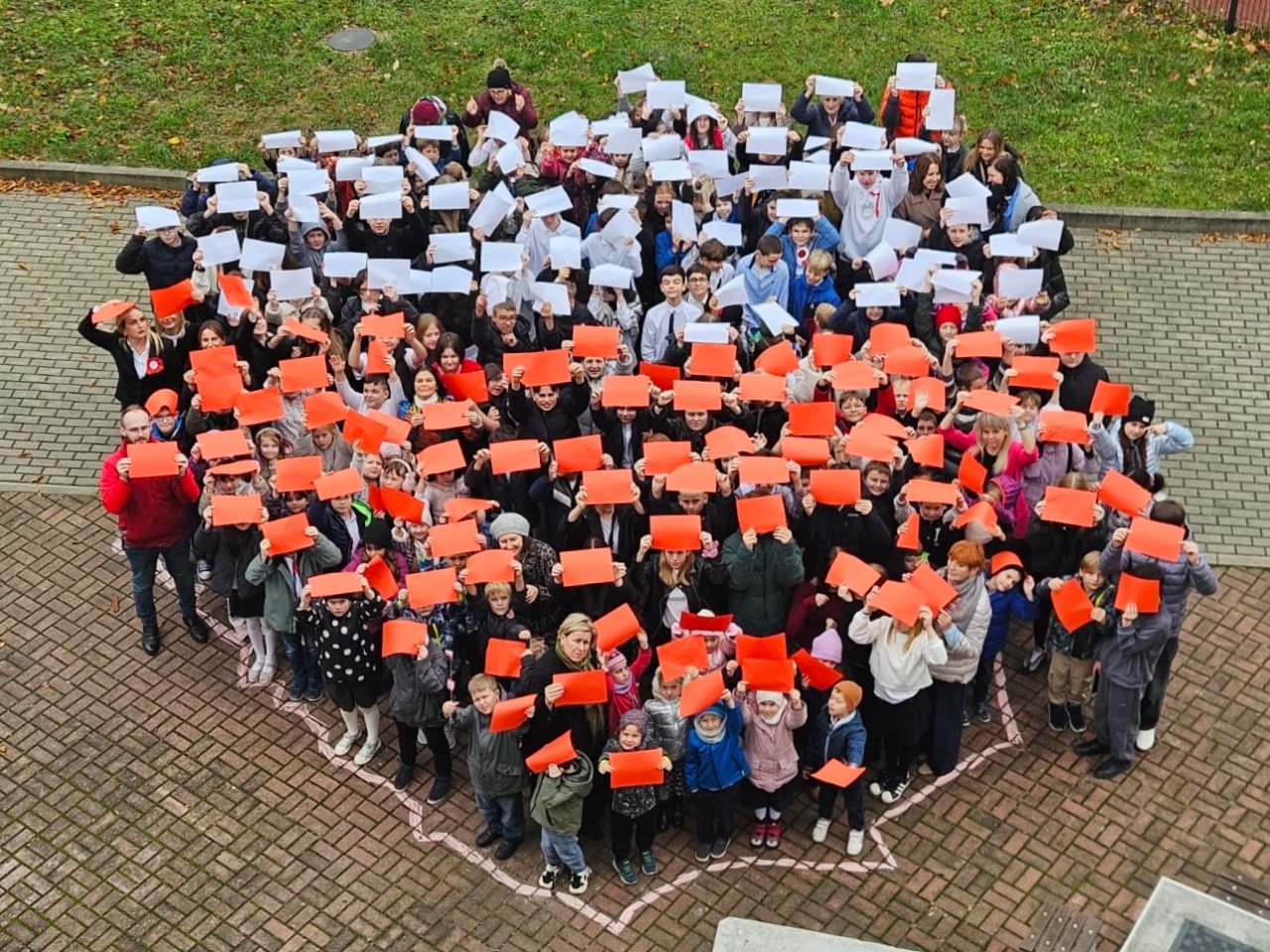 Dziś w naszej szkole obchodziliśmy Narodowe Święto Niepodległości. Podczas apelu przypomnieliśmy sobie historię naszego kraju i to, jak ważna jest wolność. Na początku wspólnie zaśpiewaliśmy pieśń Pierwszej Brygady, a o 11:11, jak co roku, odśpiewaliśmy Hymn Polski. Później ustawiliśmy się do zdjęcia, tworząc tradycyjną żywą flagę Polski na tle konturu naszej ojczyzny.