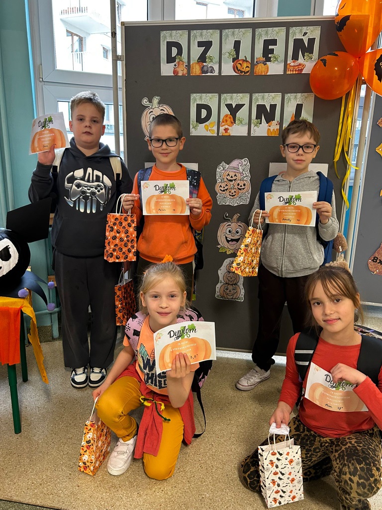 Święto Dyni w naszej szkole to prawdziwe bajkowo-dyniowe szaleństwo! Uczniowie chętnie wzięli udział w konkursie zorganizowanym z tej okazji. Wszystkie dynie były wyjątkowe, dlatego każdy uczestnik otrzymał dyplom i upominek. Tego dnia królował kolor pomarańczowy, a wszystkim dopisywał doskonały humor! 🎃